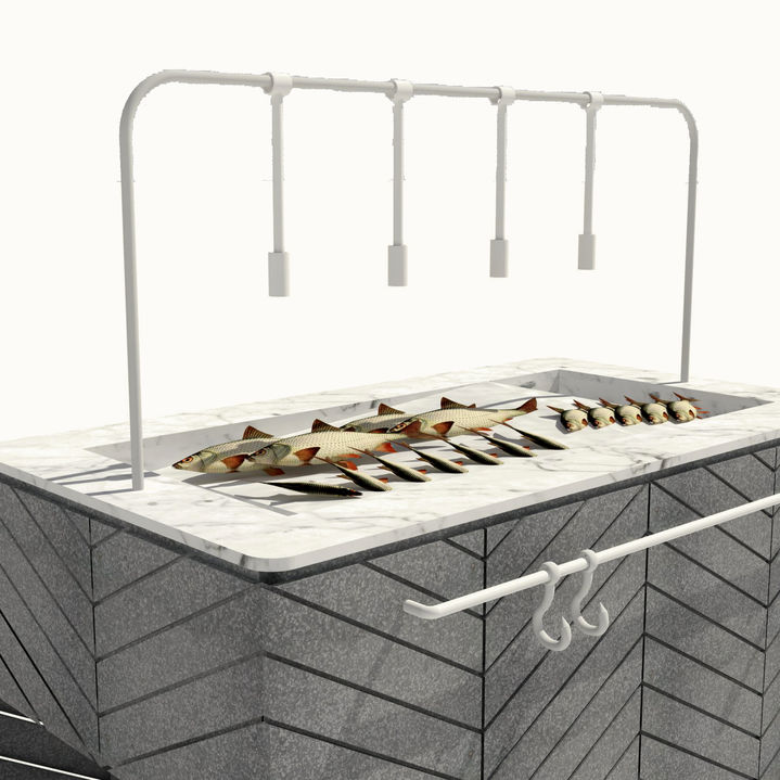 Large portable barbecue and fish display, used for events on Ekies resort. Made of galvanised steel, black steel and black marble.
